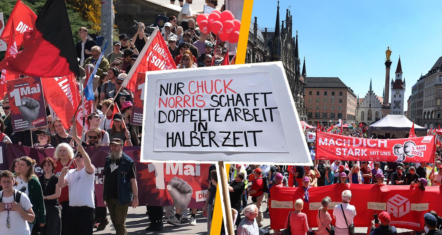 Auch wenn am Donnerstag kaum gearbeitet wurde, ging es in vielen Städten in Deutschland um die Arbeit. In Chemnitz und München gab es Demonstrationen für bessere Arbeitsbedingungen, zum Beispiel für mehr Geld, besseren Schutz auf der Arbeit oder auch kürzere Arbeitszeiten. Insgesamt waren laut den Gewerkschaften rund 330.000 Menschen bei 450 Veranstaltungen und Kundgebungen zum Tag der Arbeit dabei. Die Demonstrierenden forderten unter anderem, dass alle Menschen in Deutschland eine sichere Arbeit haben und fair bezahlt werden. Auf den Plakaten stand zum Beispiel das diesjährige Motto der Gewerkschaften: "Mach dich stark mit uns!". Auch in vielen anderen Ländern gab es zum 1. Mai große Demonstrationen.